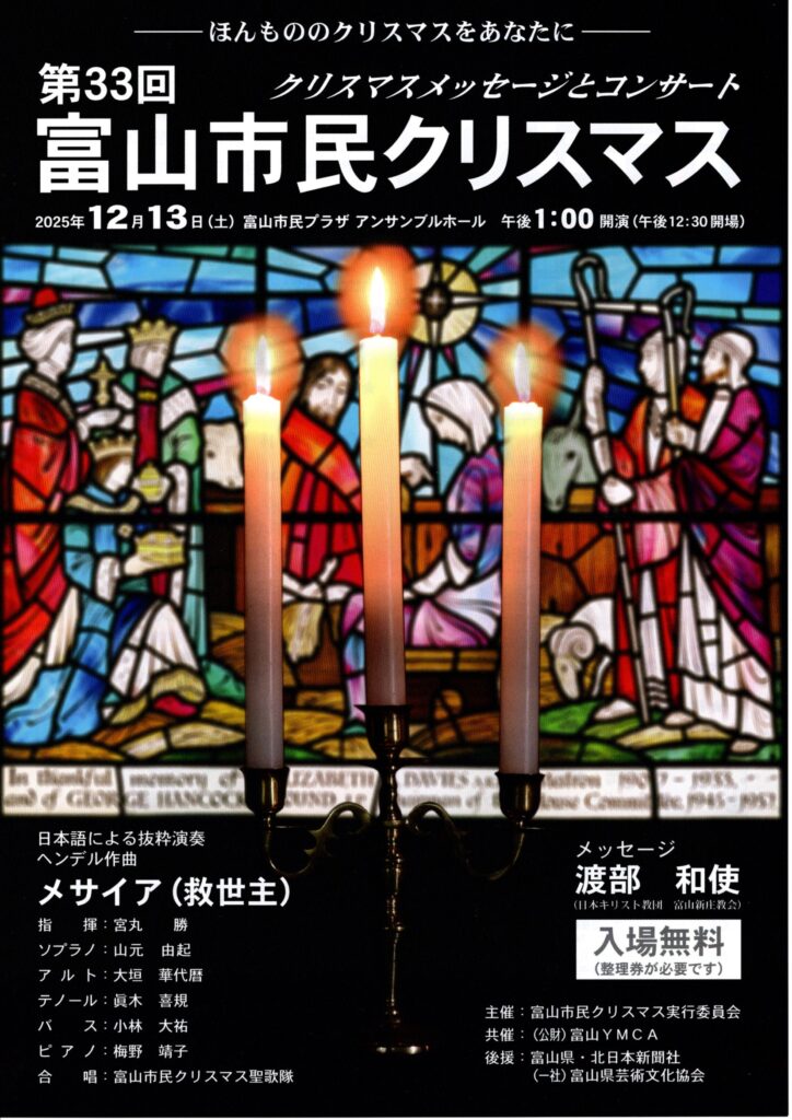ニュース 2025年富山市民クリスマスのご案内 2025-11-13 今年も富山市民クリスマスが、12月13日(土)13時~15時まで富山市民プラザアンサンブルホールにて行われます。 入場料は無料です。整理券が無くても席が空いていればご入場いただけます。是非ともお越しください。